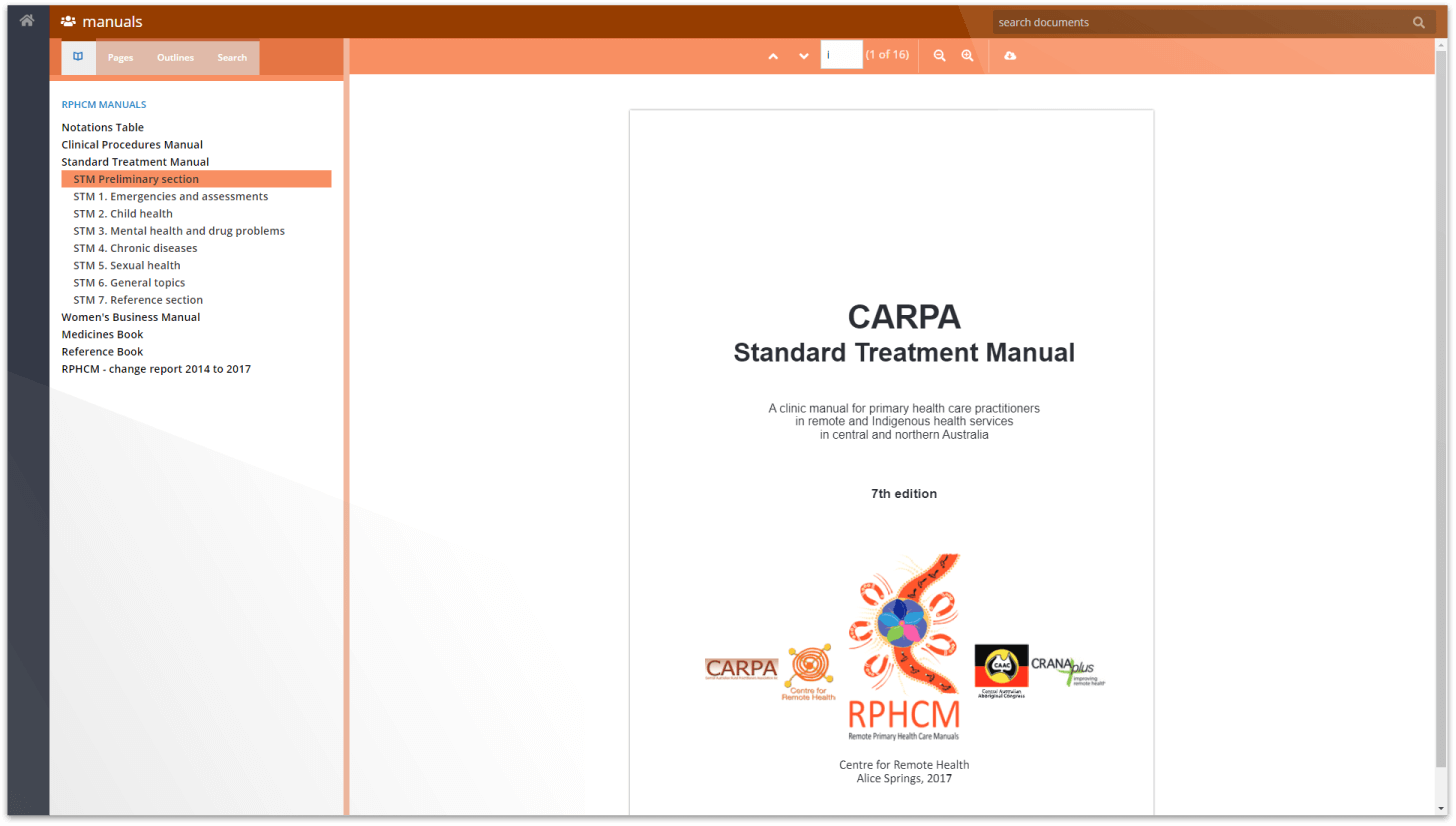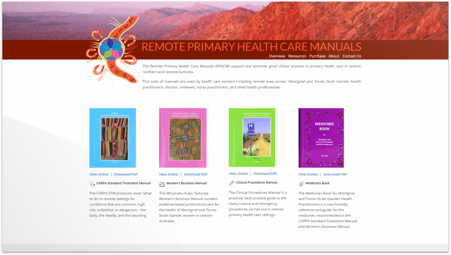 The Remote Primary Health Care Manuals is a suite of manuals designed to support good clinical practice in primary health care in Central, Northern and remote Australia. They are widely used in clinical care, health service systems, education and orientation in the Northern Territory, remote South Australia, Ngaanyatjarra and Kimberley regions in Western Australia and beyond.