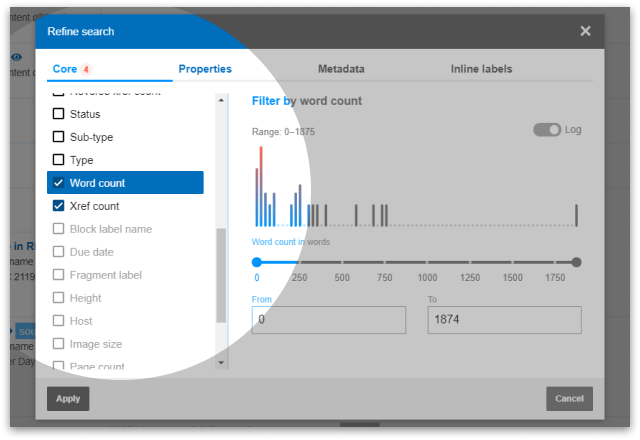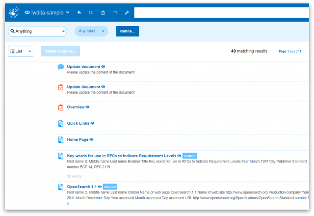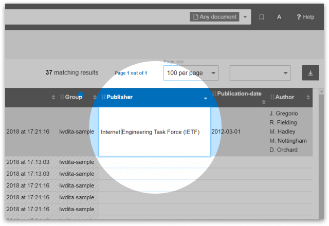 Based on widely supported Apache Lucene, PageSeeder search is fast and rich. The API services provide facet support for user-defined semantics such as document, block and inline labels. The results of a search can be input into other processes such as validation or publishing task.