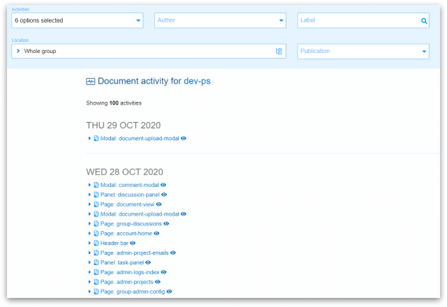 The Activity report helps to track all changes, by person or date, to a publication, including: